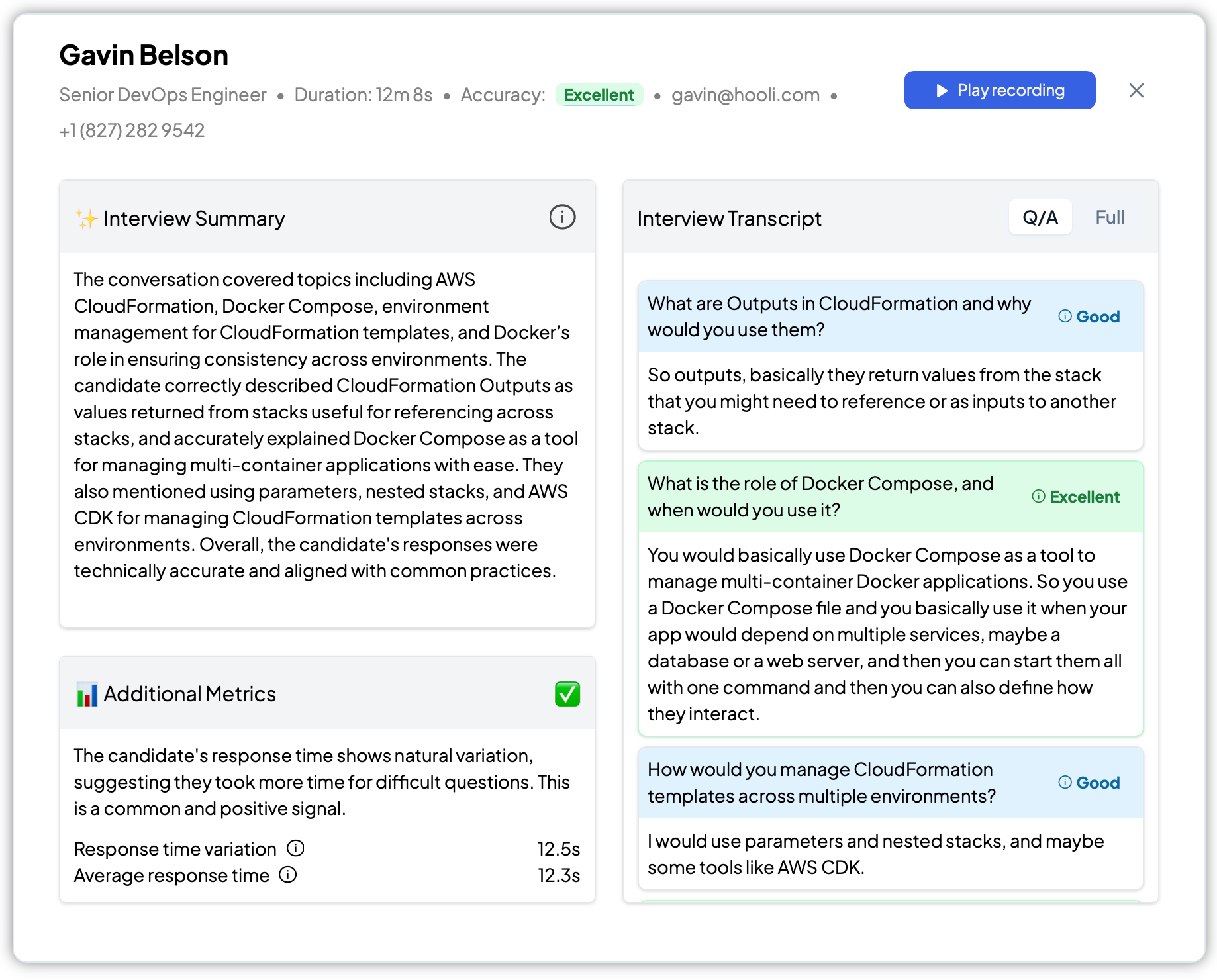 - Data-Driven Decisions: Once an interview is complete, you receive a comprehensive report containing an audio recording, a full transcript, an AI-generated summary, and a clean Q&A transcript. This allows your recruiters to quickly review the results and confidently present the best-matched candidates to your clients.